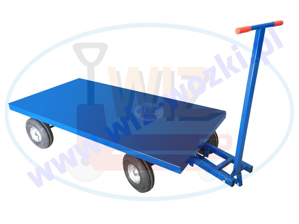 Wózek platformowy ręczny o nośności 1500 kg, wysokość platformy od podłoża 480 mm (koła pełne fi 400 mm) lub 380 mm (koła pompowane fi 350 mm). Na zamówienie istnieje możliwość wykonania uchwytu przystosowanego do zaczepienia do wózka widłowego. Koła pełne o średnicy 400 mm łożyskowane kulkowo, koła pompowane o średnicy 350 mm łożyskowane kulkowo z felgą aluminiową. Przednia oś skrętna wózka zamocowana na zwrotnicy łożyskowanej kulkowo.