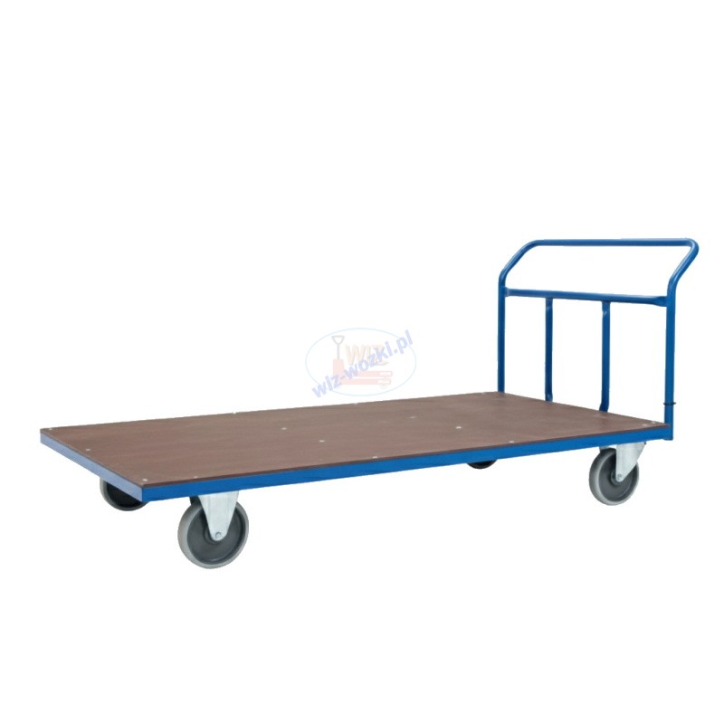 Wózek magazynowy, którego jesteśmy producentem, z dużą platformą 180x80 cm, z 1 poręczą, burtą z bardzo wytrzymałą, wodoodporną sklejką z antypoślizgową powierzchnią, co będzie zapobiegać "ślizganiu" się towaru po platformie. Platforma 1,8x0,8m doskonale sprawdzi się do transportu mebli, materacy, dużych mebli, czy też płyt gipsowych, meblowych czy MDF.